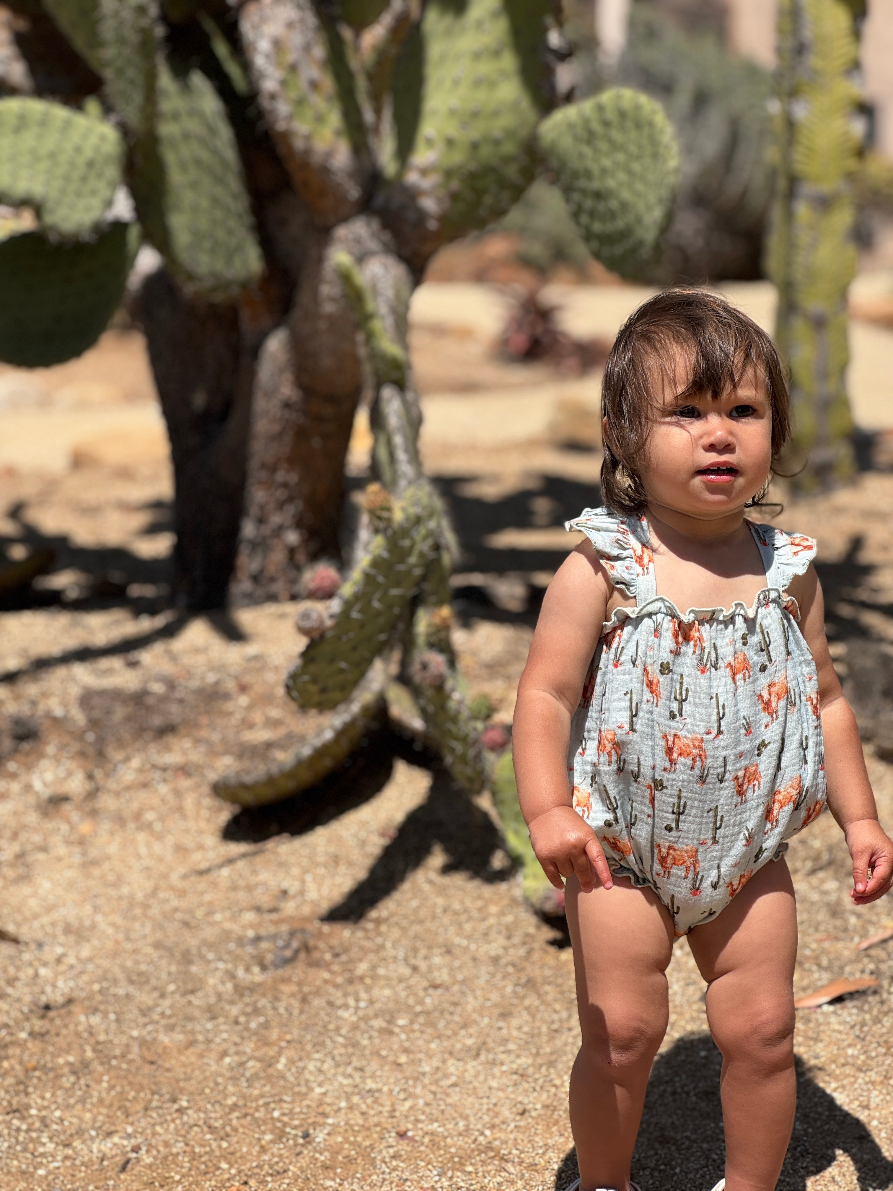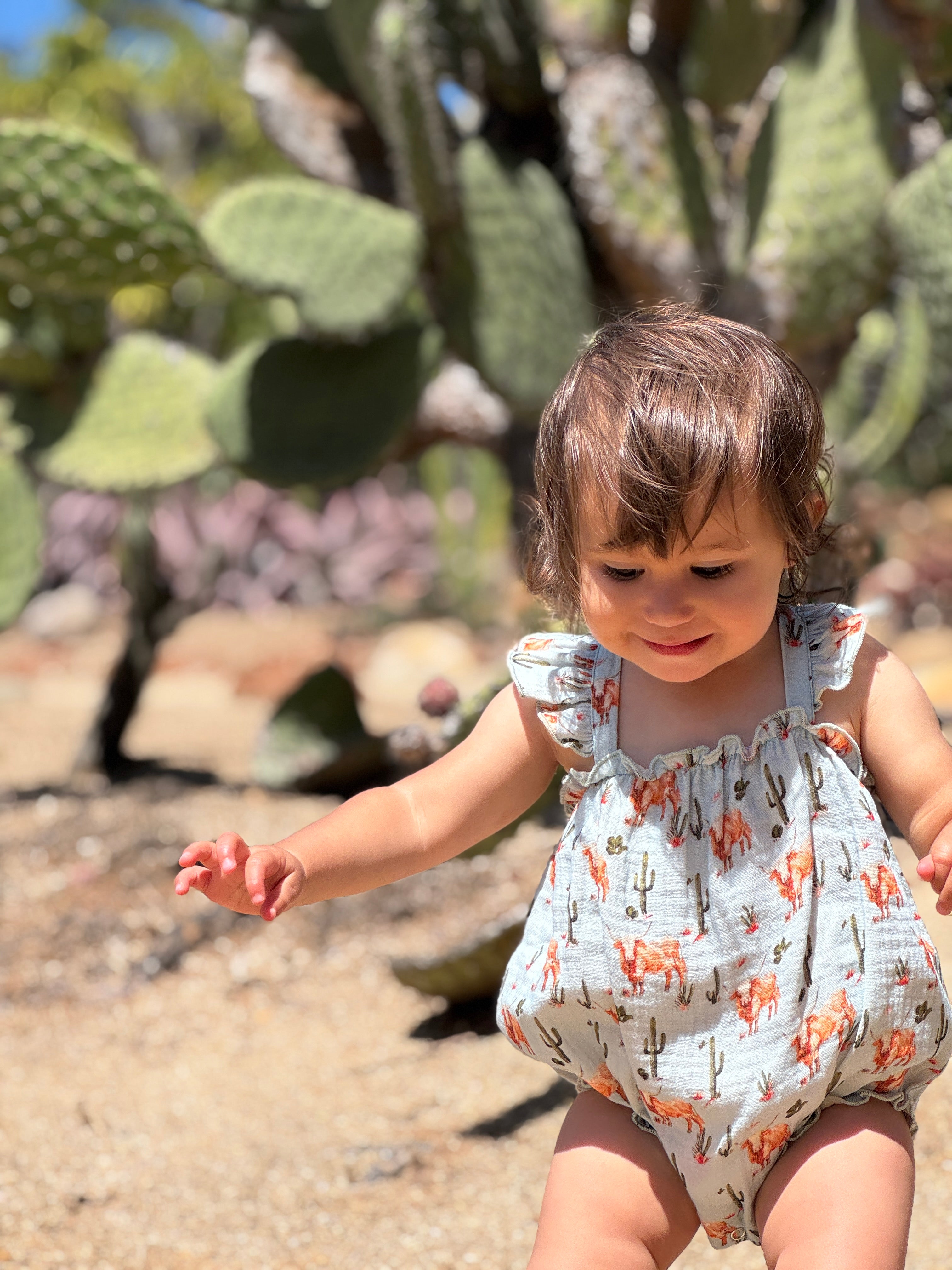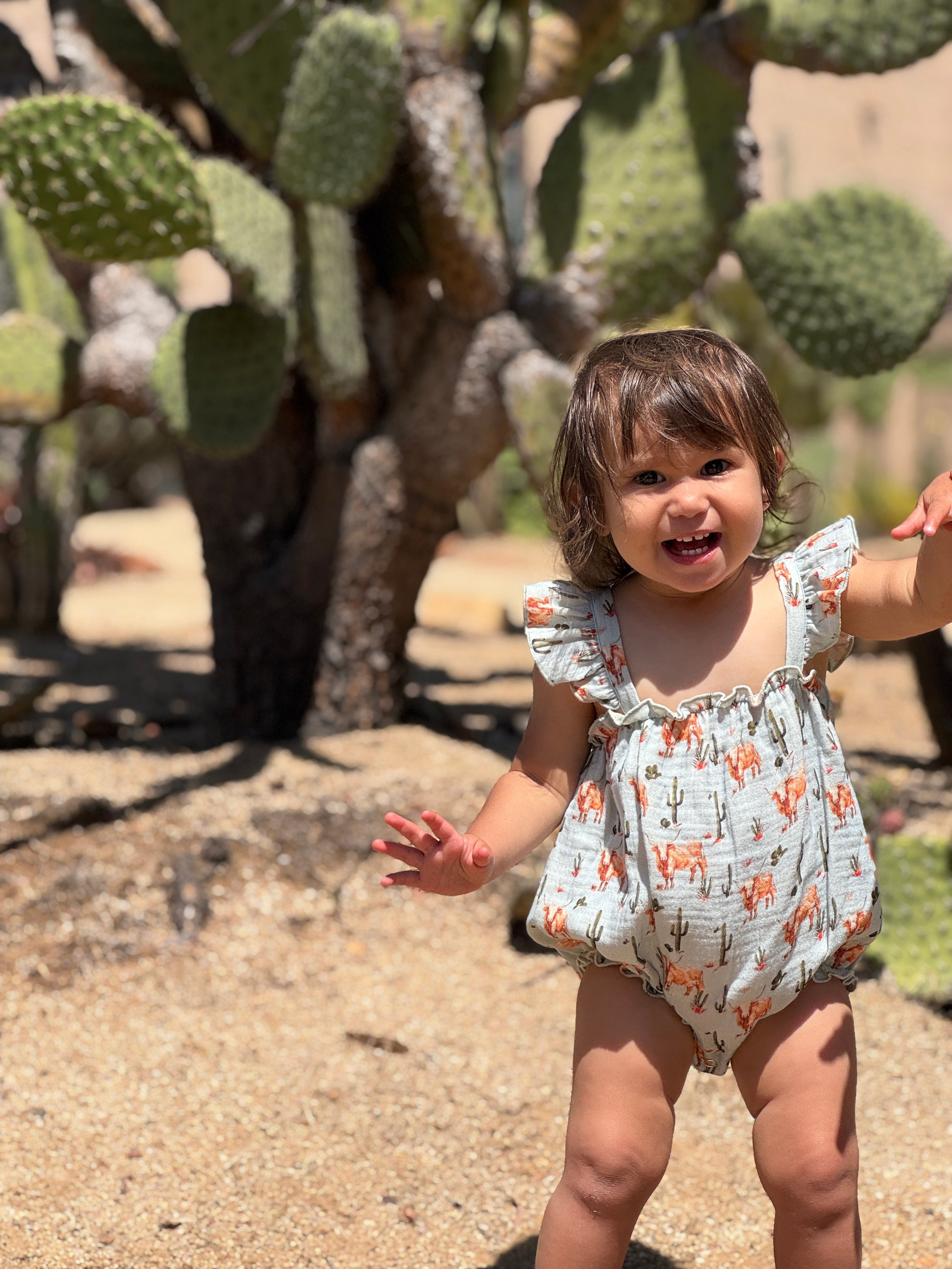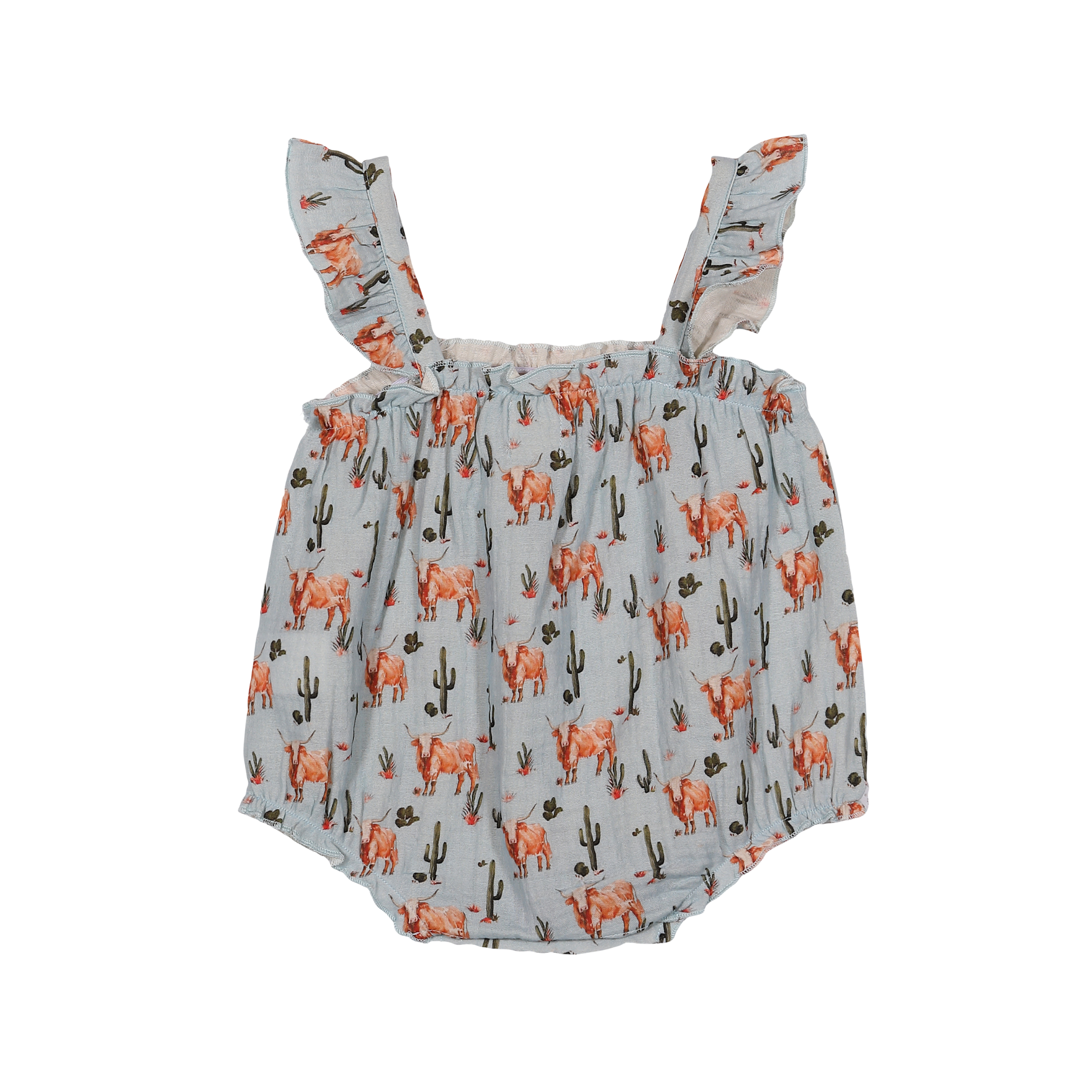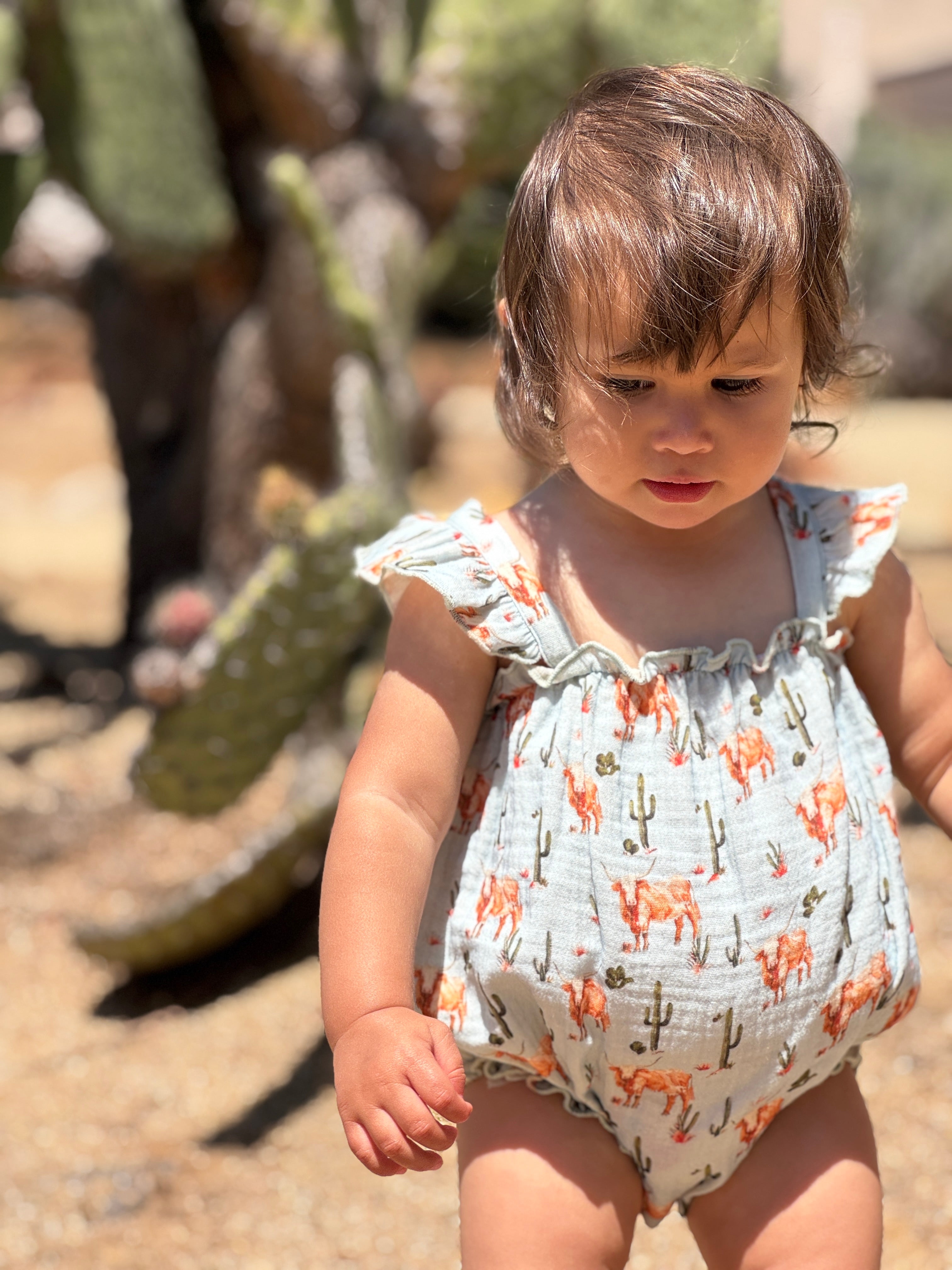 Perfect for the new little ranch hand in your family! Our cute cow herd print little bubble features ruffled straps and gentle elasticated leg openings creating a darling gathered bubble-like shape.