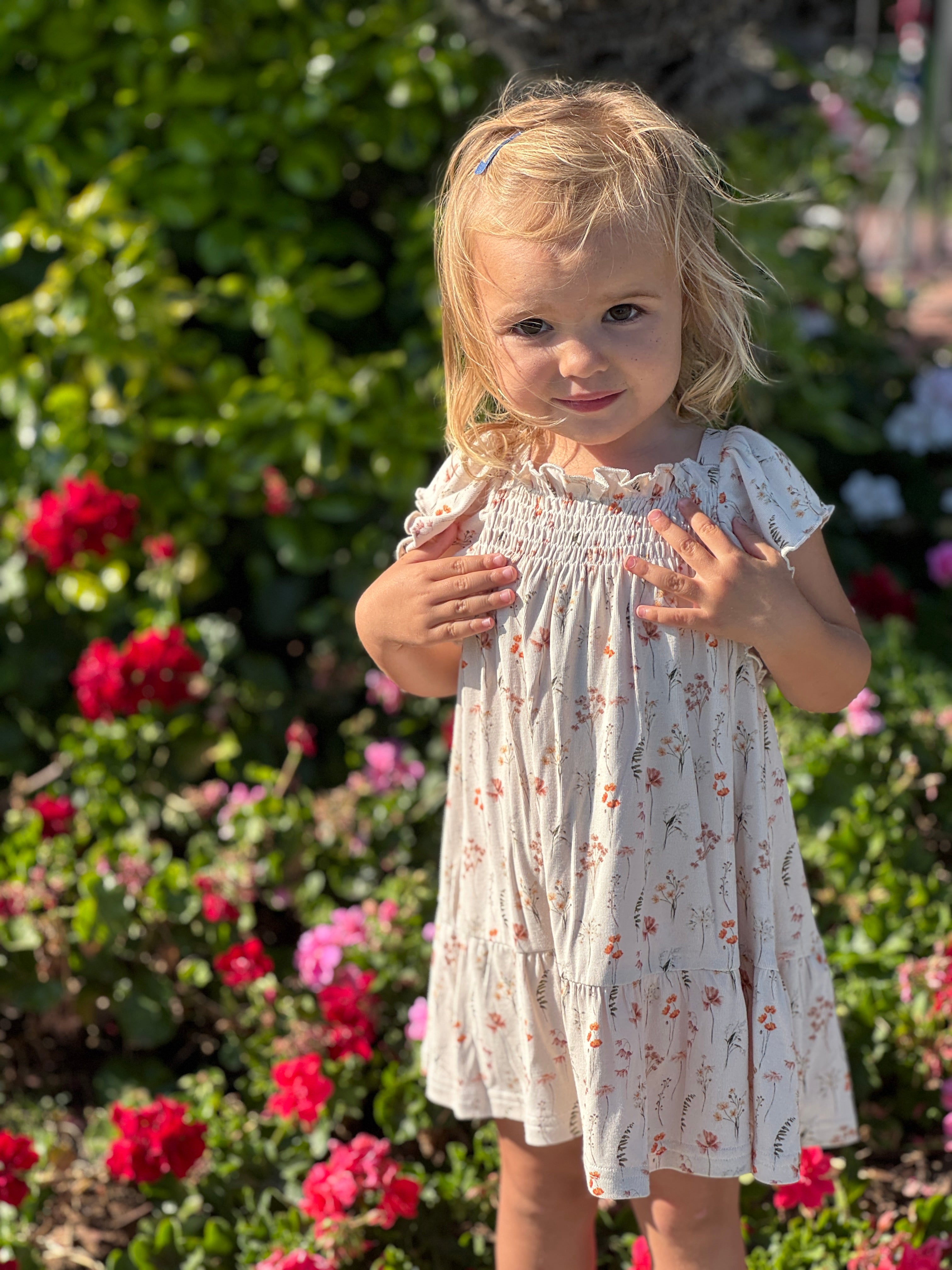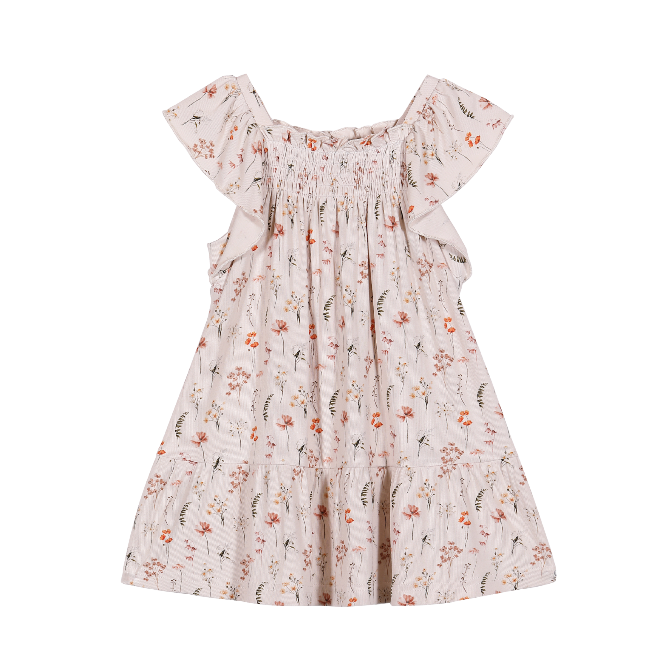 How pretty is this dress with an A-line silhouette, tiered skirt and short ruffled sleeves. The scooped neckline has a little ruffle from the smocking detail across the bodice. In a delicate forest flower print this could be just perfect for those summer parties or dress up occasions.