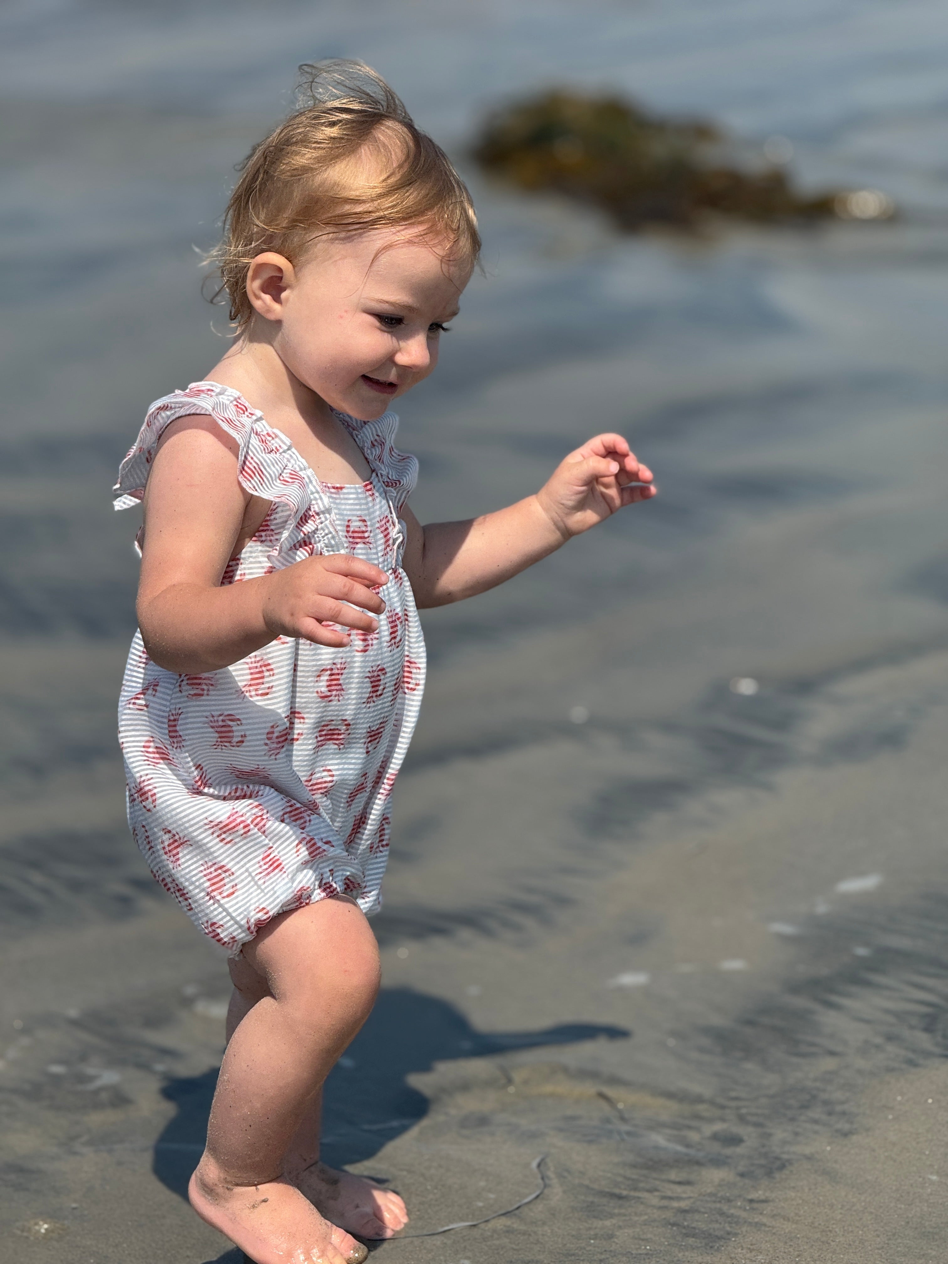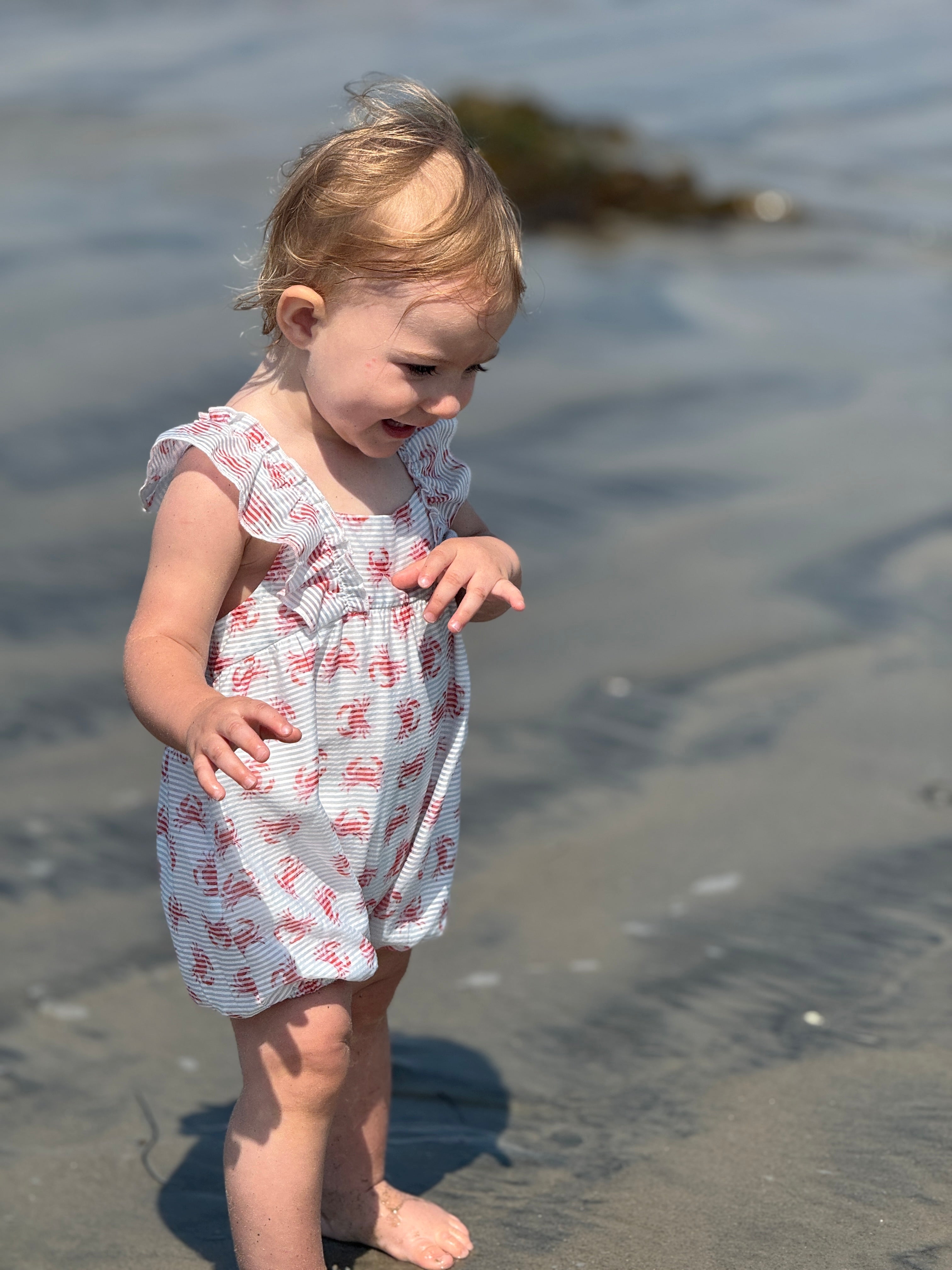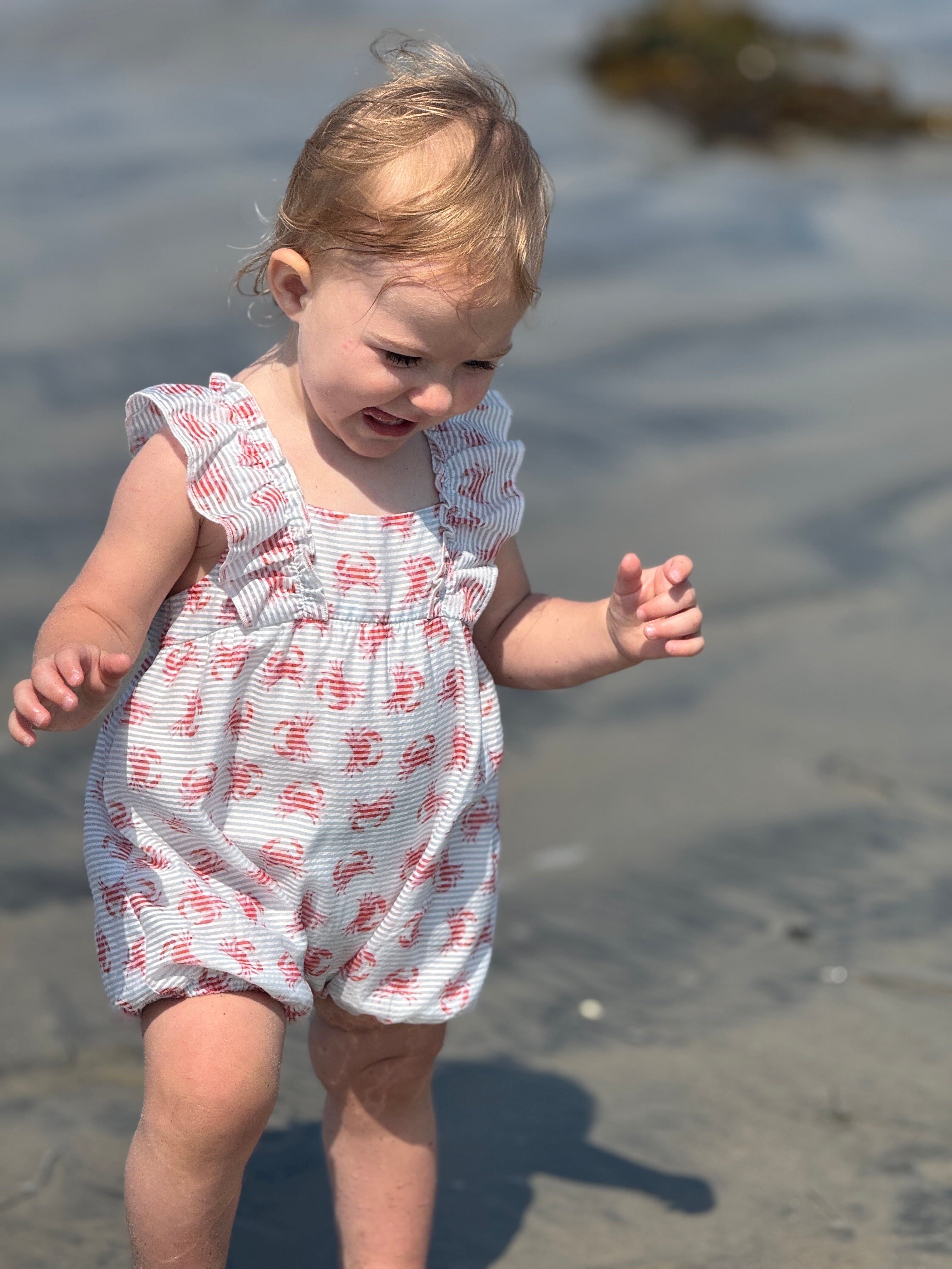 Beach vacation ready in our cute crabs printed bubble. Ruffled detailing around the shoulders that extend to a criss-cross back design. Gentle elasticated legs for comfy fit. Super soft cotton