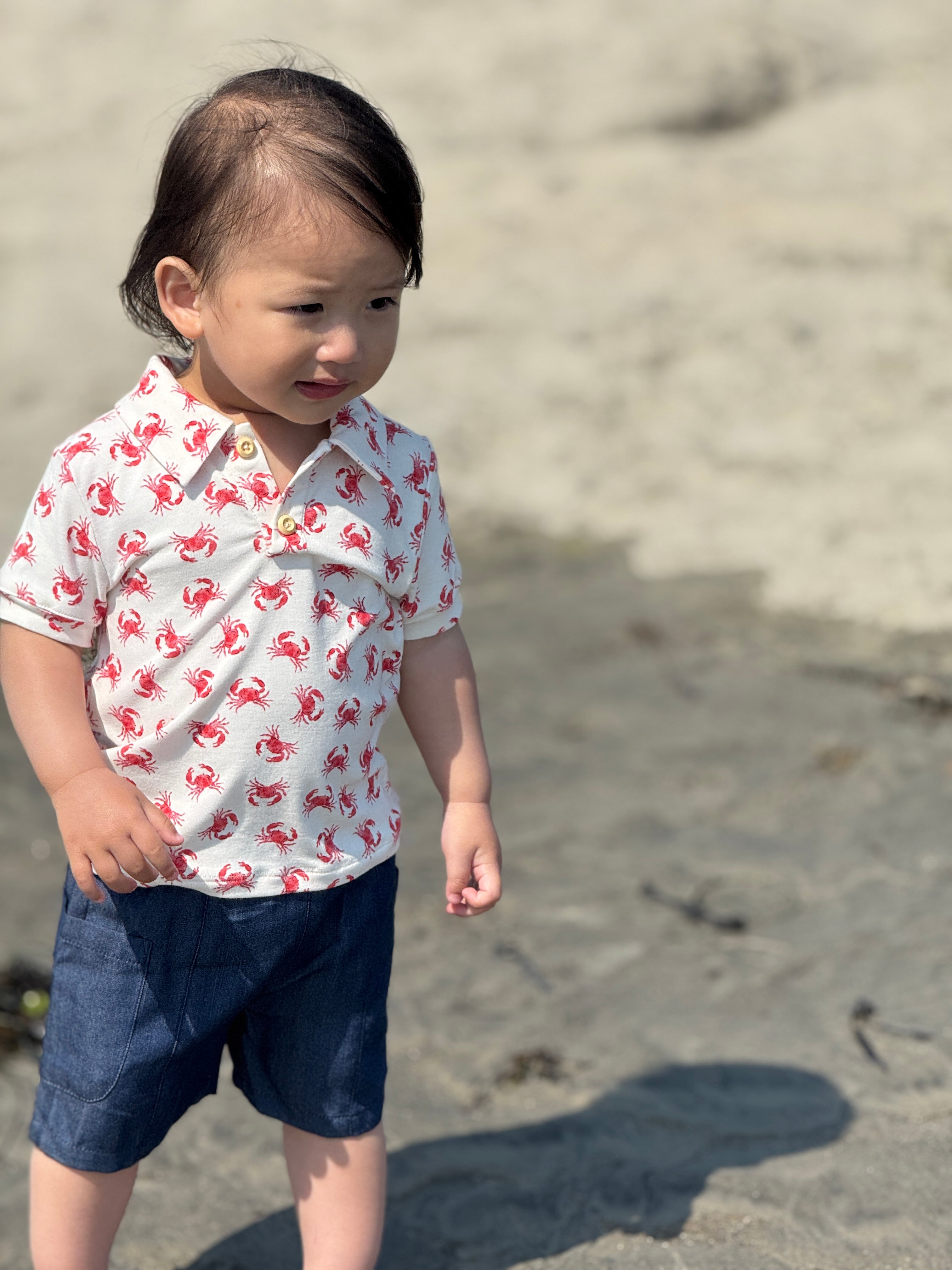 Polo shirt and shorts set in our cute crab print. The perfect comfy and cool outfit for summer beach adventures.